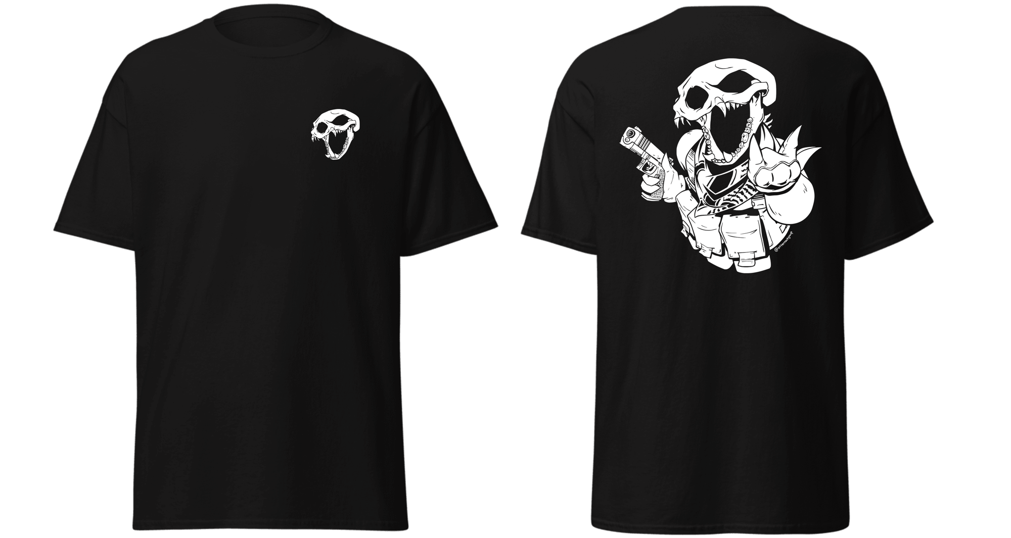 S - XL sized black 100% cotton t-shirts. Screen-printed designs on the front and back.